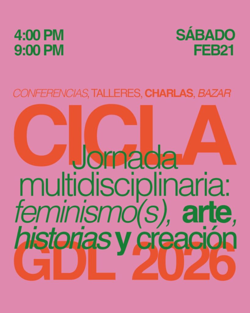 En esta edición de CICLA el eje de reflexión y práctica es el arte, abordado desde perspectivas críticas, históricas y feministas. El evento se llevará a cabo el sábado 21 de febrero de 4 a 9 pm. La jornada comenzará con una conferencia sobre historia del arte con perspectiva de género, impartida por Sofía Peña, seguida de un conversatorio sobre muralismo feminista impartido por Grecia Rivas y cierra con la lectura de un manifiesto y convivencia.